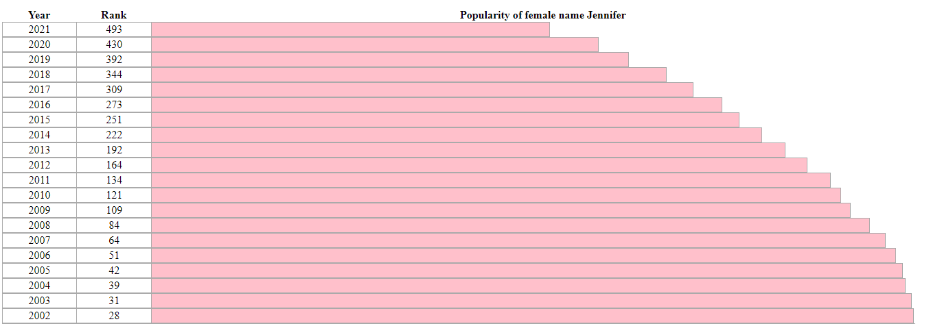 - Not rapidly changing in popularity (4%): We didn’t want our daughter to have a name that “dates” her as above or below a certain age range, like how “Elsa” probably means that you were born in 2014: