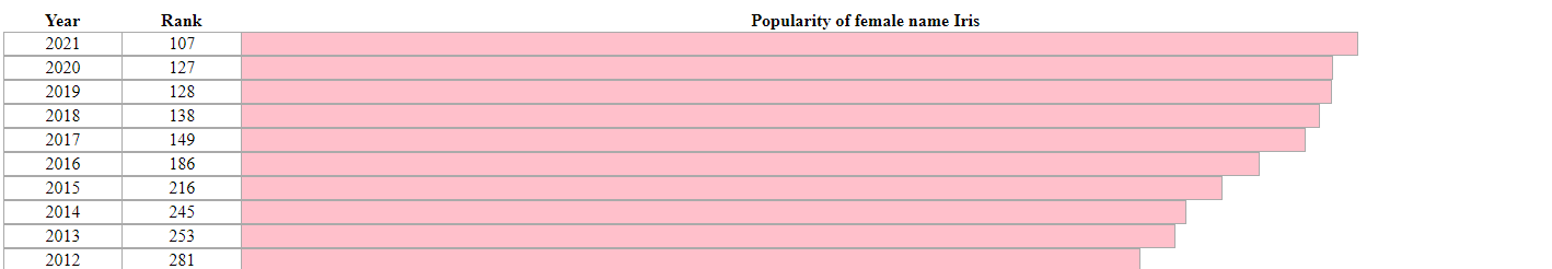 Meanwhile, “Iris” ranked 40th overall with a score of 91%, getting less than full marks for not being Christian in origin (3%), being an English word (2%), rising quickly in popularity recently (2%, see the graph below), which could take it into “too popular” territory soon (1%), and being common in Singapore according to one source (1%).