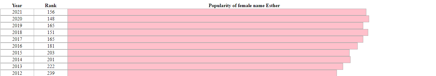 The overall distribution of scores was fairly normal with a mean of 80.5%, a minimum of 48% to a maximum of 97%. “Esther” tied for 3rd best score overall with a score of 96%. It only lost points for being six letters long (2%), rising in popularity recently (1%, see the graph below), and for being common in Singapore according to one source (1%).